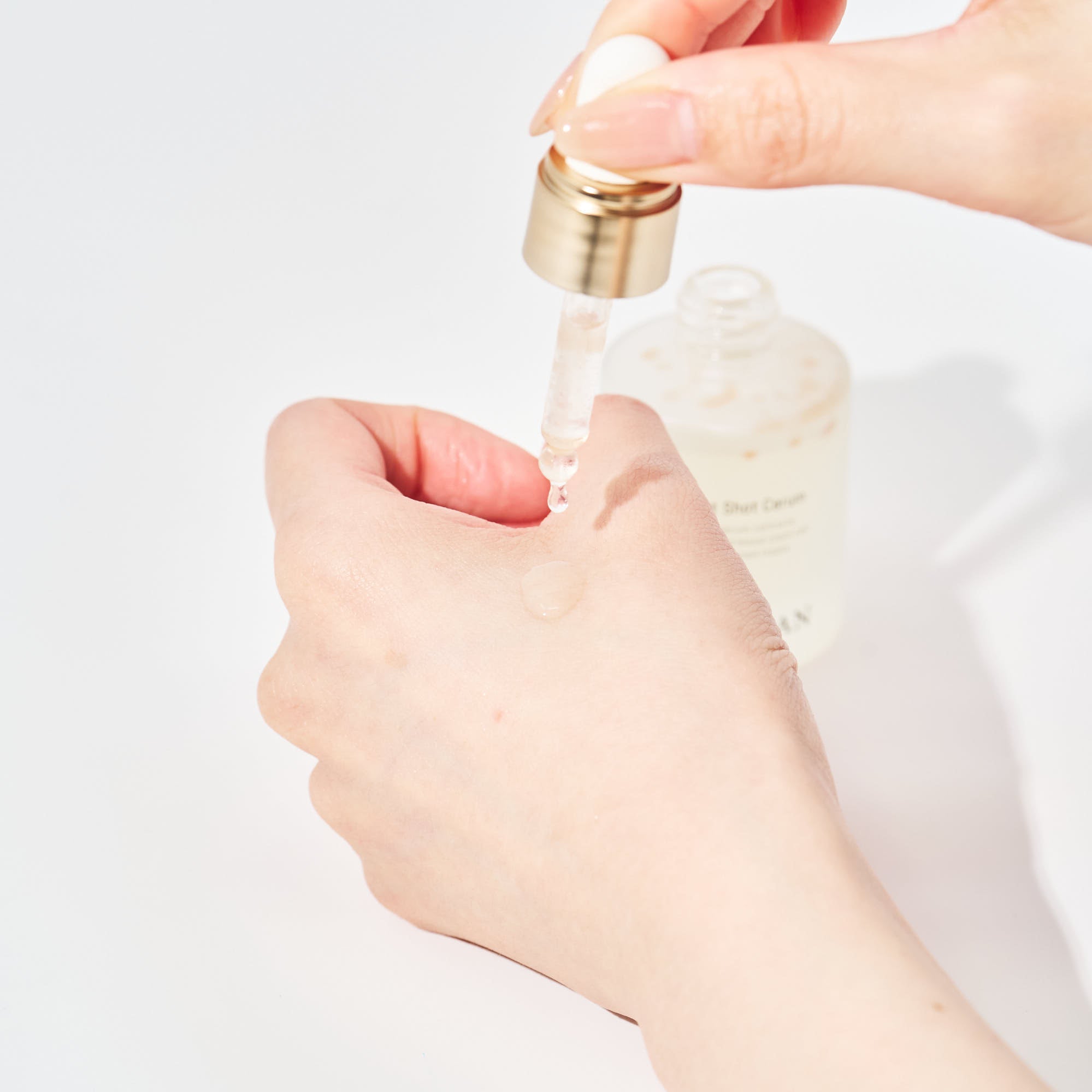 2. スポイトの約半分程度(0.5mL前後)を手のひらにとり、顔全体にていねいになじませます。